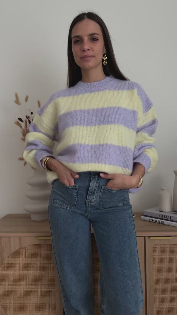 - Filato Morbido a righe lilla e giallo pastello